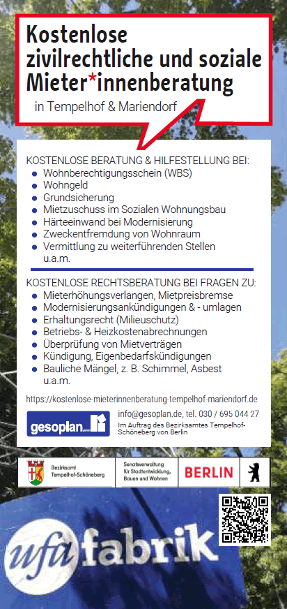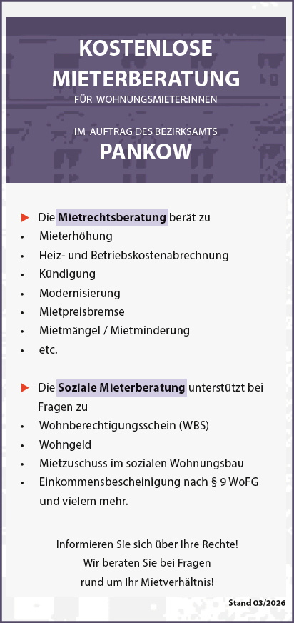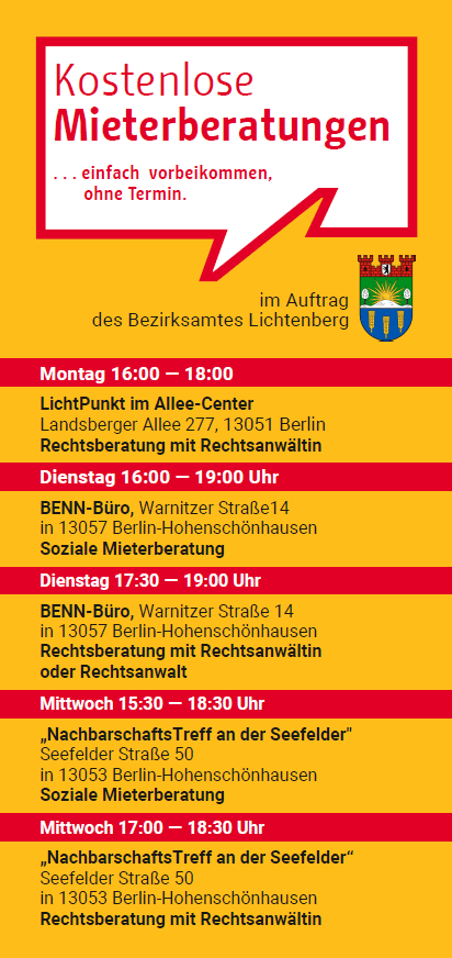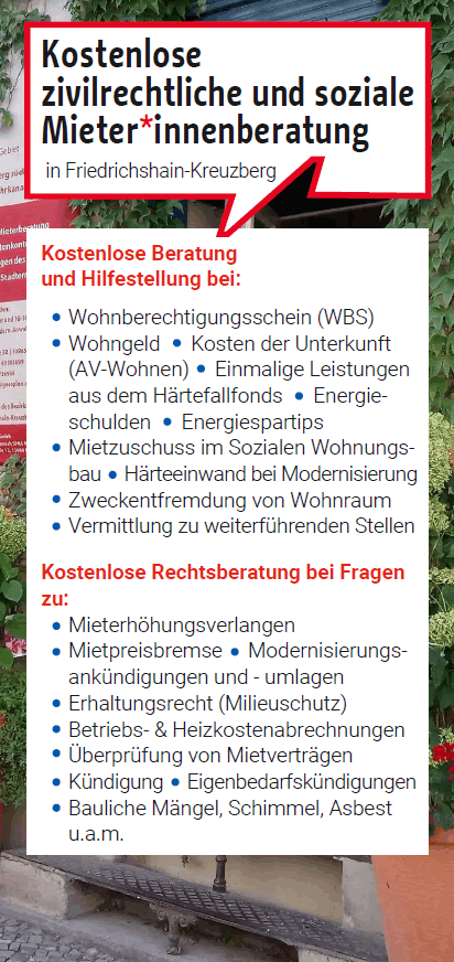 Wir sind eine kostenlose Anlaufstelle für Mieter:innen in fünf Bezirken Berlins. Unsere Rechtsanwält:innen und Berater:innen bieten Information und Beratung zu allen mietrechtlichen und sozialen Fragen.